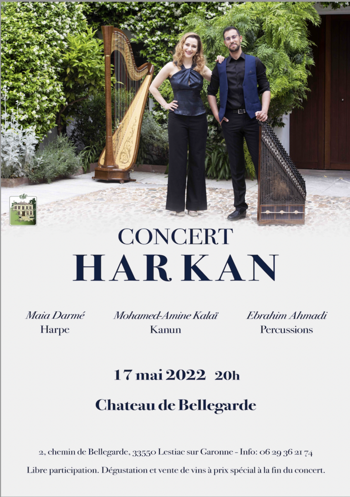 Le château de Bellegarde accueille Harkan, trio inédit mêlant harpe à pédales française, kanun tunisien et percussions kurdes iraniennes (daf, dayereh, dahol, bendir).
