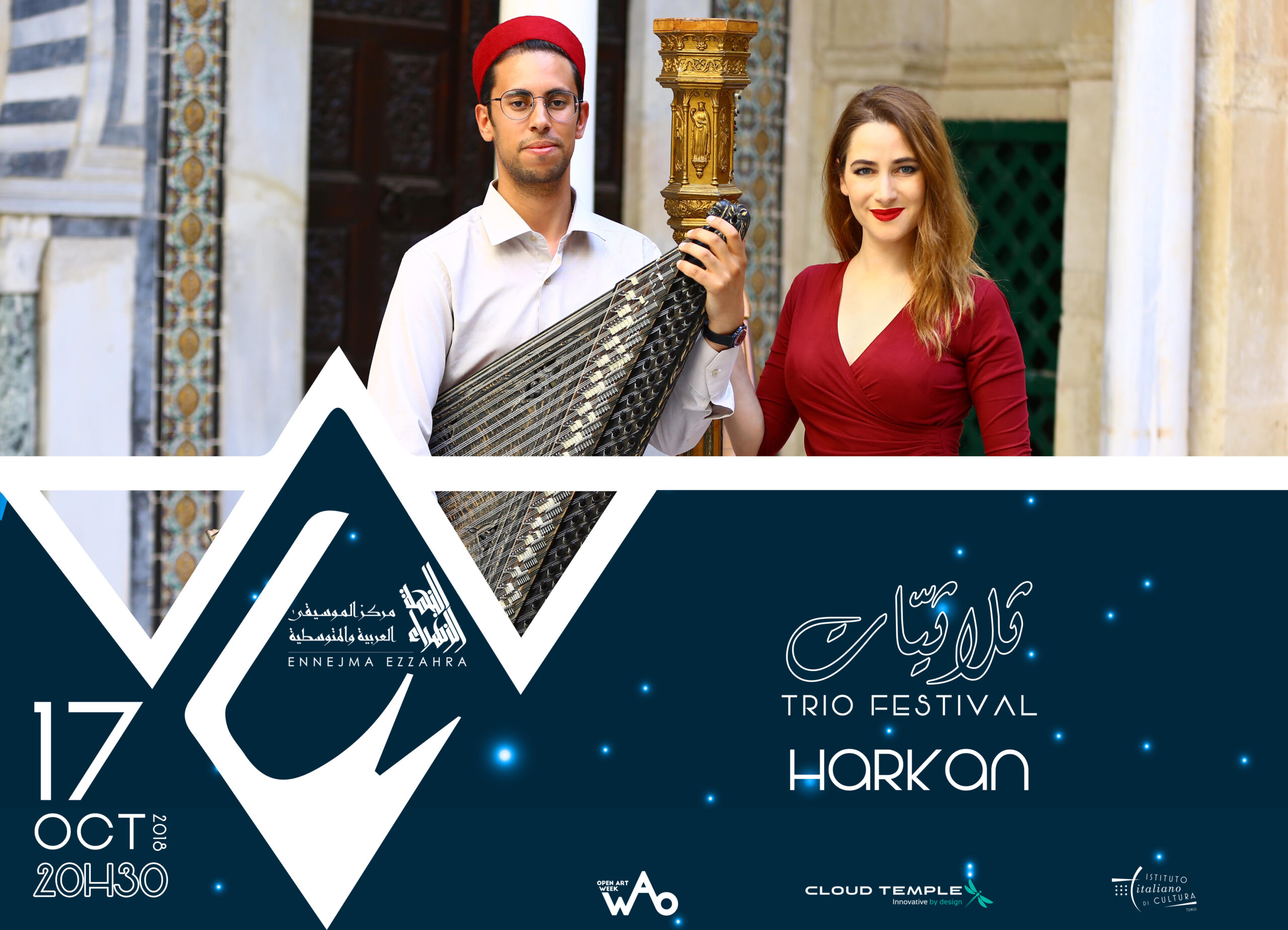Dans le cadre du festival Trio du CNAM (Centre National des Musiques Arabes et Méditerranéennes). Une formation inédite, deux instruments impressionnants, un répertoire éclectique … Harkan est un projet musical acoustique hors-pair, qui réunit des virtuoses français et tunisiens. Le duo formé par Mohamed Amine Kalaï au qanun et Maïa Darmé à la harpe émerveille et transporte. A eux deux, mille et une cordes et autant de saveurs. Sur scène, ils sont accompagnés par Lotfi Soua aux percussions traditionnelles.