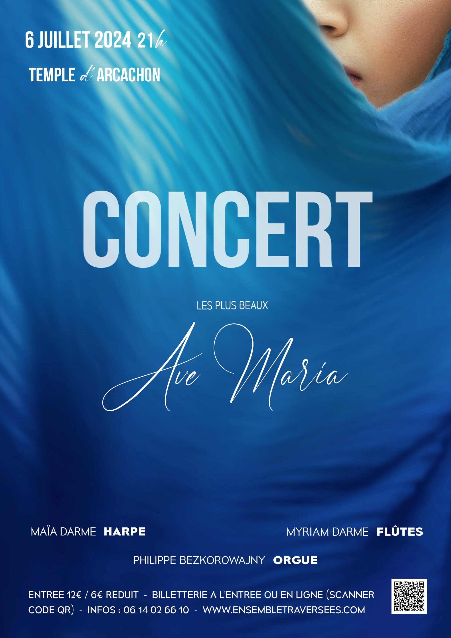Dans le cadre de la saison musicale de l’Abbatiale de Guîtres, Myriam Darmé (flûte), Philippe Bezkorowajny (orgue) et Maia Darmé (harpe), trois musiciens de renom aux riches carrières individuelles, se retrouveront le temps d’une soirée autour des plus beaux hommages musicaux à la Vierge Marie. L’occasion de réentendre les Ave Maria de Bach-Gounod, Schubert, Caccini, Piazzolla, Haydn ou Mascagni, mais également de découvrir de superbes prières traditionnelles ou signées de Braun, Guilain, Boëllmann et Dandrieu.
