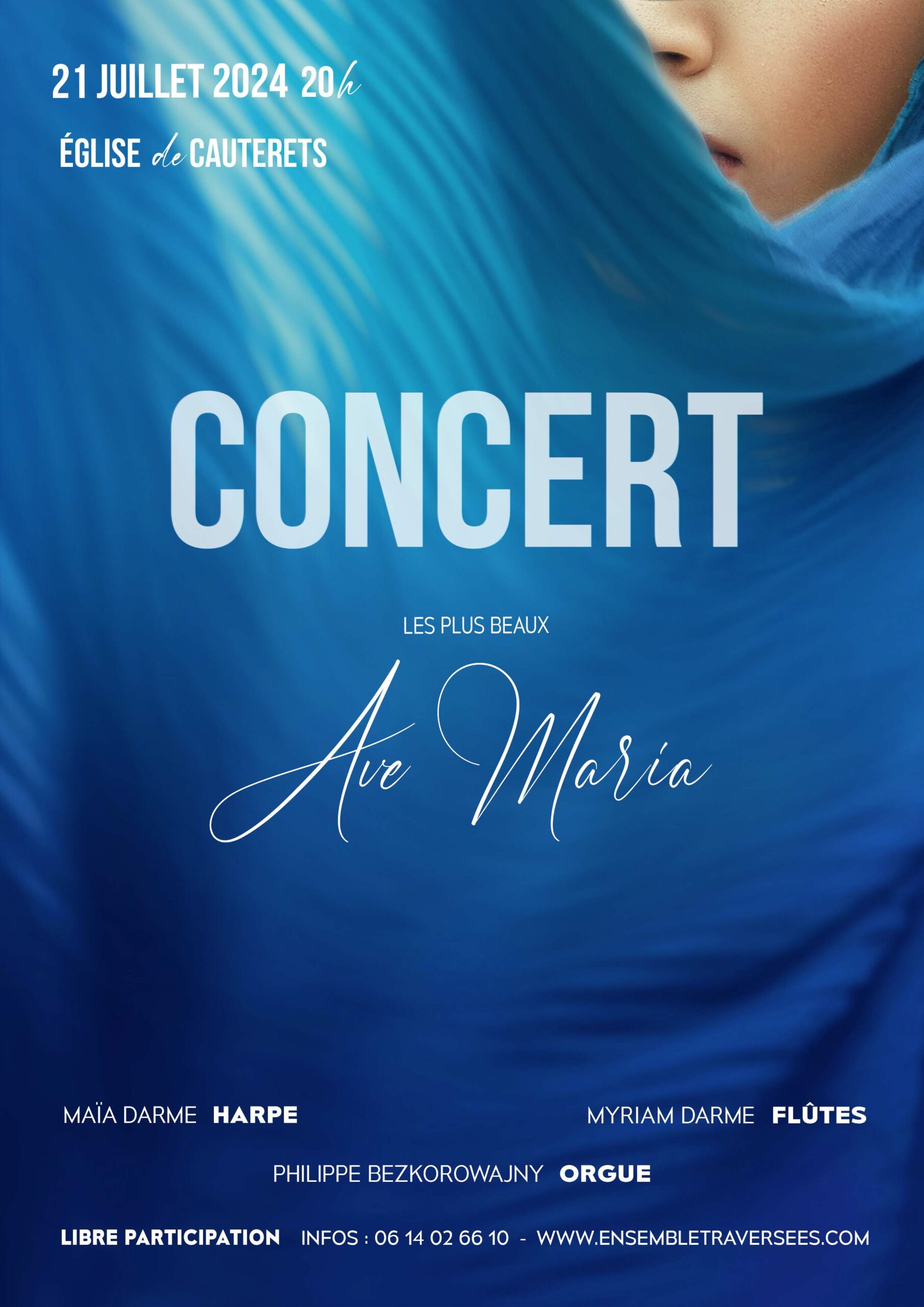 Myriam Darmé (flûte), Philippe Bezkorowajny (orgue) et Maia Darmé (harpe), trois musiciens de renom aux riches carrières individuelles, se retrouveront le temps d’une soirée autour des plus beaux hommages musicaux à la Vierge Marie. L’occasion de réentendre les Ave Maria de Bach-Gounod, Schubert, Caccini, Piazzolla, Haydn ou Mascagni, mais également de découvrir de superbes prières traditionnelles ou signées de Braun, Guilain, Boëllmann et Dandrieu.